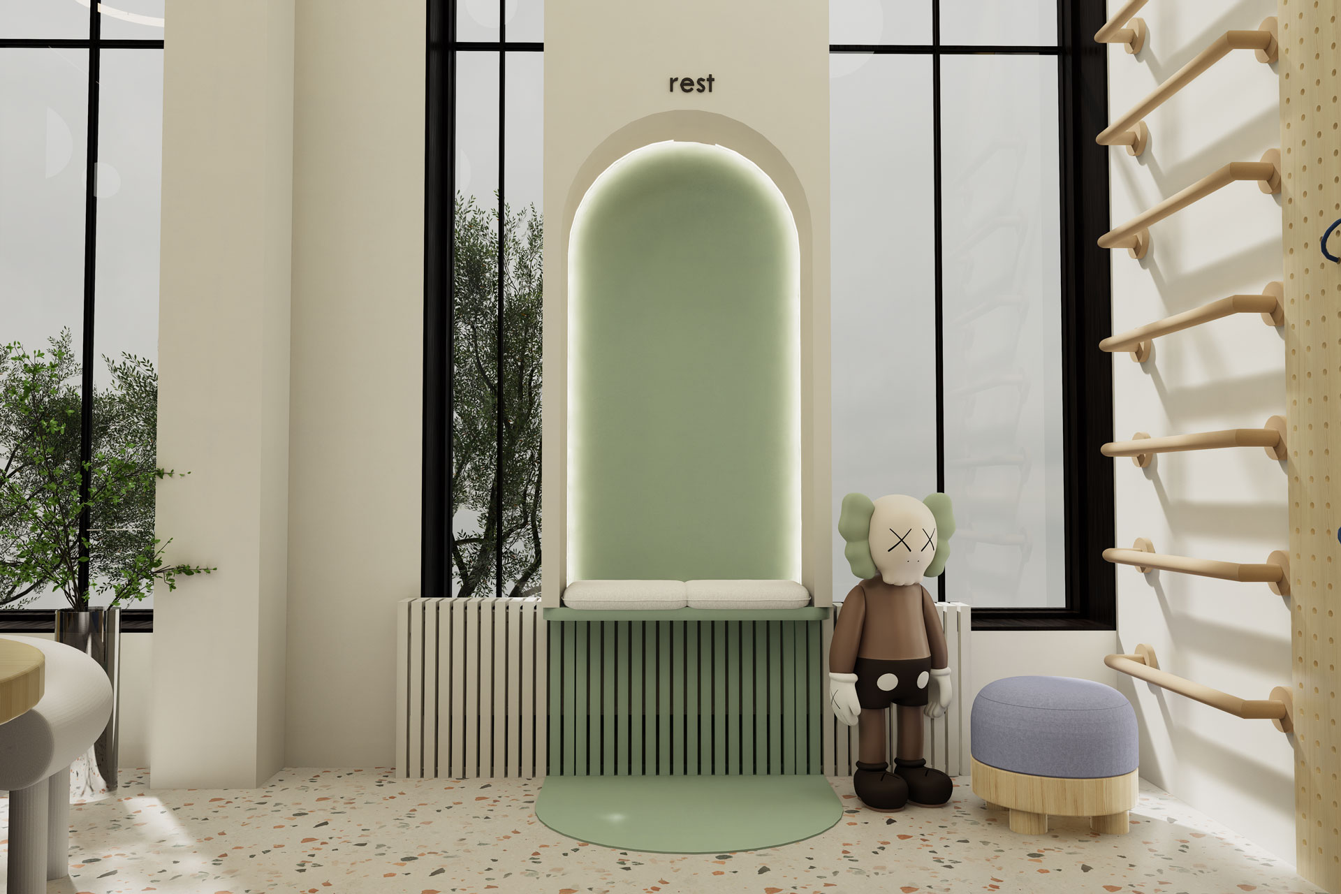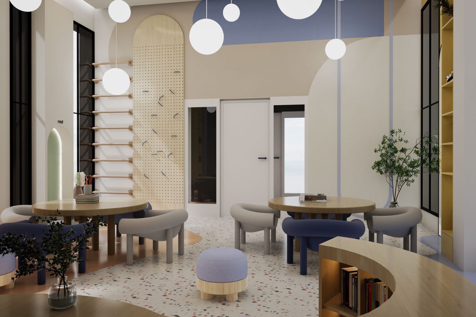 The color palette is soft, pastel, and balanced, carefully chosen to avoid overstimulation. Nothing shouts visuallyâeverything whispers safety. The terrazzo floor is both playful and grounding. Furniture is like grown-up toys: curved, stable, and comforting in shape.