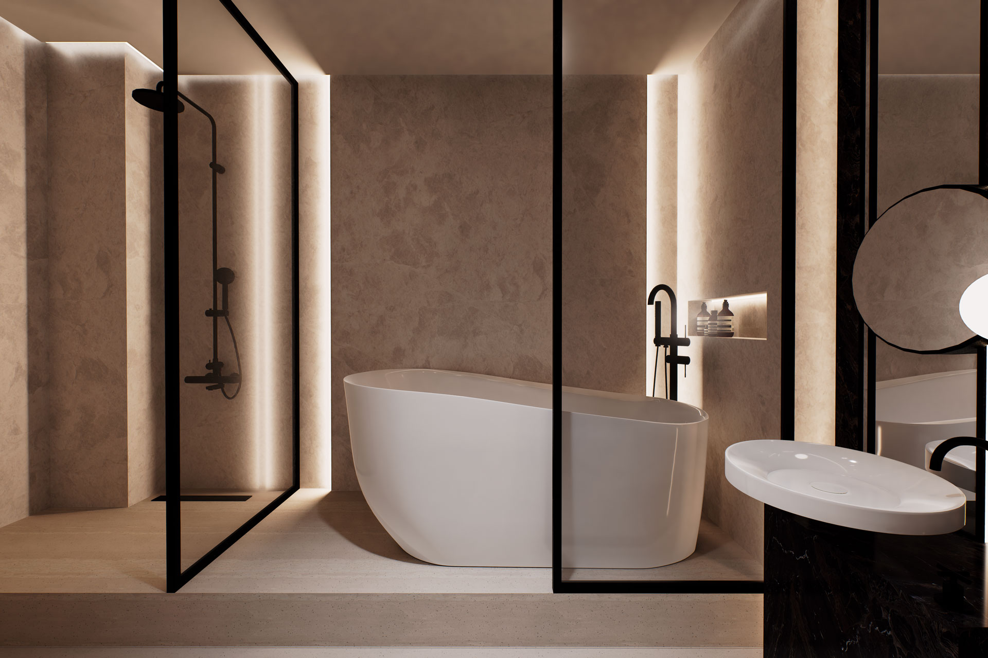 The material palette conveys warmth and tranquility, dominated by natural wood, matte finishes, and neutral tones that enhance a harmonious atmosphere. Lighting—both natural and artificial—is delicately integrated to highlight textures and create an intimate and refined ambiance.